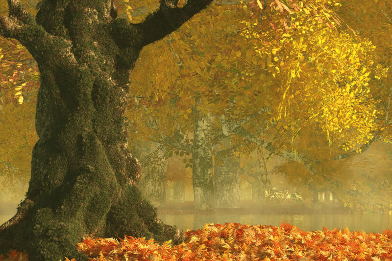 An old mossy oak tree grows alongside a forest lake. It's autumn and all around it is a carpet of bright red, yellow, and orange ferns and leaves. Behind it, the gentle waters of a forest pond reflect the fall colors of the trees beyond. This background is 6000 x 4000 pixes and contains two layers.